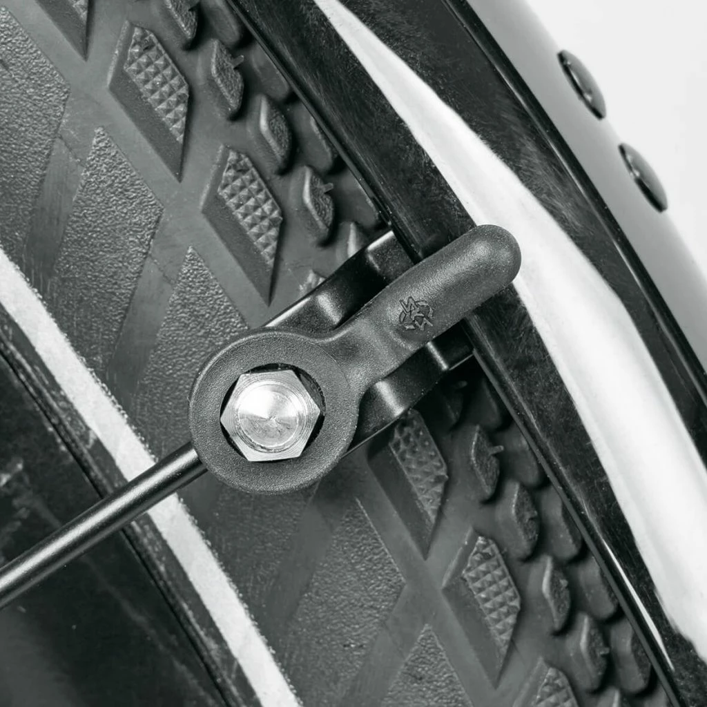 Le kit de garde boue Blumels est doté d’un système de sécurité ASR de SKS : un connecteur à tête ronde fait le lien entre les tringles et l’accroche sur le vélo, ce système de sécurité permet aux tringles de se détacher rapidement en cas d’accrochage afin d’éviter la chute ou le déséquilibre du cycliste en cas d’accrochage, d’une branche d’arbre par exemple ou d’un autre obstacle.